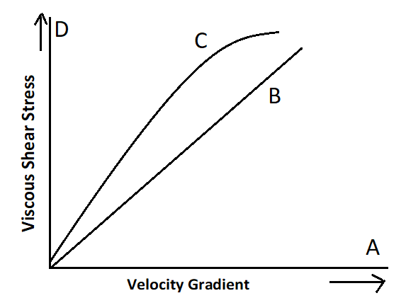| 37 | In the figure given above, for the Non – Newtonian fluid, the curve that is applicable is:  | A | B | C | D | c | General relationship b/w shear stress and velocity gradient is given by. \(τ=μ(\frac{du}{dy})^{n}+B\) Newtonian Fluid: Straight line passing through the origin. Constant viscosity (slope = μ). Non-Newtonian Fluids: Pseudo plastic (Shear-thinning) – Curve slopes up but flattens out.e.g., Paint, blood. Dilatant (Shear-thickening) – Curve gets steeper as shear rate increases.e.g., Corn-starch in water. Bingham Plastic –e.g., Toothpaste, mud. | Comments | Active | |