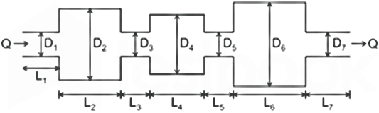 | 22 | if etc be the lengths and et(c) be the diameters of the parts of a compound pipe, then length L and diameter D of a uniform equivalent pipe will be related as under \(l_{1}, l_{2}, l_{3}\) \(d_{1}, d_{2}, d_{3} \) | \(\frac{L}{D}=\frac{l_{1}}{d_{1}}+\frac{l_{2}}{d_{2}}+\frac{l_{3}}{d_{3}}+…\) | \(\frac{L}{D^{2}}=\frac{l_{1}}{d12}+\frac{l_{2}}{d22}+\frac{l_{3}}{d32}+…\) | \(\frac{L}{D^{3}}=\frac{l_{1}}{d13}+\frac{l_{2}}{d23}+\frac{l_{3}}{d33}+…\) | \(\frac{L}{D^{5}}=\frac{l_{1}}{d15}+\frac{l_{2}}{d25}+\frac{l_{3}}{d35}+…\) | d | Total loss developed in a series of pipes is the sum of local losses plus losses in each pipe. In series: If n numbers of pipes are arranged in series then the discharge in all the pipes is equal, from the conservation of mass principle.  i.e. \(Q_{1}=Q_{2}=Q_{3}=Q_{4}=Q_{5}=…=Q\) The local losses are all the minor losses that occur because of sudden expansion or sudden contraction, entry and exit losses, and due to bends. And the major losses due to friction i.e. \(h_{l}=\frac{flV^{2}}{2gd},h_{1}=\frac{fL_{1}V12}{2gD_{1}},h_{2}=\frac{fL_{2}V22}{2gD_{3}}\) \(h_{eq}=\frac{fL_{eq}Veq2}{2gD_{eq}}=\frac{fL_{eq}Qeq2}{12Deq5}=(minor losses+major losses)in each pipe\) \(\frac{L_{eq}}{Deq5}=\frac{L_{1}}{D15}+\frac{L_{2}}{D25}+\frac{L_{3}}{D35}+\frac{L_{4}}{D45}+\frac{L_{5}}{D55}+…\) | Comments | Active | |