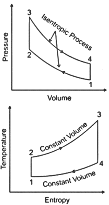 | 65 | In an Otto cycle, how does heat addition takes place? | Irreversible at constant pressure | Irreversibly at constant volume | Reversibly at constant pressure | Reversibly at constant volume | d |  The air – standard – Otto cycle is the idealized cycle for spark – ignition internal combustion engines. The Otto cycle 1 – 2 – 3 – 4 consists of the following four processes: Process 1 – 2: Reversible adiabatic compression of air Process 2 – 3: Heat addition at constant volume Process 3 – 4: Reversible adiabatic expansion of air Process 4 – 1: Heat rejection at constant volume | Comments | Active | |