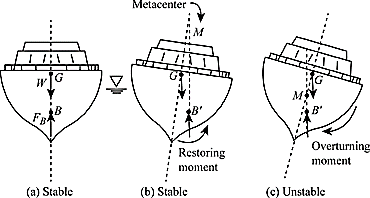| 88 | What data is required to determine the stability of a floating body? | Angle of tilt of the floating body | Mass of the floating body | Displaced volume of the floating body | Position of the metacenter | d |  • Stable equilibrium: The metacenter is above the centre of gravity of the body, then the disturbing couple is balanced by restoring couple, the body will be in stable equilibrium. • Unstable equilibrium: The metacenter is below the centre of gravity of the body, then the disturbing couple is supported by restoring couple, the body will be in unstable equilibrium. • Neutral equilibrium: The metacenter and the centre of gravity coincides at the same point, then the body is in neutral equilibrium. | Comments | Active | |