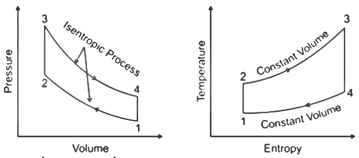 | 85 | Air standard Otto cycle consists of: | Two constant pressures and two constant entropy processes | Two constant volumes and two constant entropy processes | Two adiabatic and two isothermal processes | Two constant pressures and two constant volume processes | b | The air – standard – Otto cycle is the idealized cycle for the spark – ignition internal combustion engines. The Otto cycle 1 – 2 - 3 – 4 consists of following four process: Process 1 – 2: Reversible adiabatic compression of air Process 2 – 3: Heat addition at constant volume Process 3 – 4: Reversible adiabatic expansion of air Process 4 – 1: Heat rejection at constant volume  | Comments | Active | |