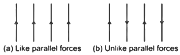 | 73 | Parallel force have their lines of action: | Transverse to each other | Perpendicular to each other | Tangential to each other | Parallel to each other | d | • Like Parallel Forces: The forces, whose lines of action are parallel to each other and all of them act in the same direction as shown in Figure are known as like parallel forces. • Unlike Parallel Forces: The forces, whose lines of action are parallel to each other and all of them do not act in the same direction as shown in Figure are known as unlike parallel forces.  | Comments | Active | |
