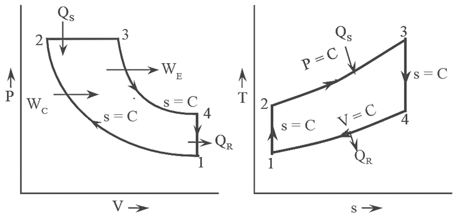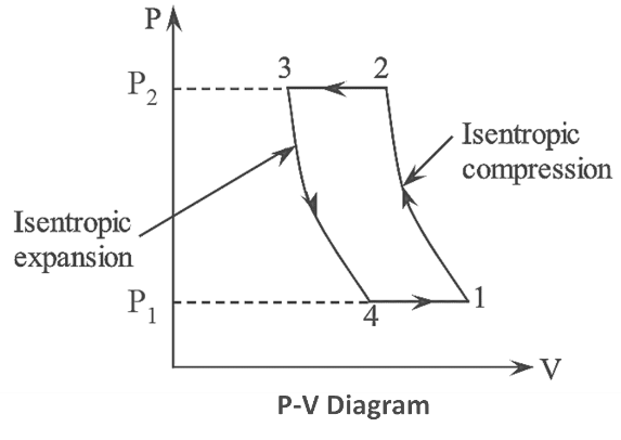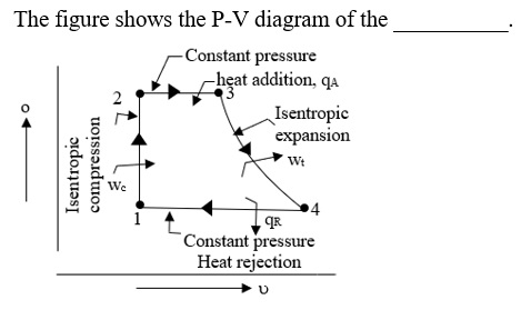 | 71 | The figure shows the P – V diagram of the ______.  | Otto cycle | Open cycle gas turbine | Steam turbine | Steam engine | b | Brayton cycle consist of 4 processes- Isentropic compression (in a compressor) Constant – pressure heat addition Isentropic expansion (in a turbine) Constant – pressure heat rejection | Comments | Active | |