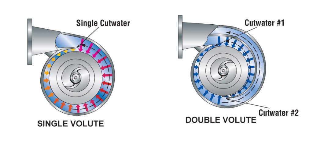 | 57 | Which of the following is the correct item for Double Volute in centrifugal pumps? | Flow separation does not take place | Flow is separated into two unequal streams by two-cut waters that are 90° apart | Flow is separated into two equal streams by two-cut waters that are 90° apart | Flow is separated into two equal streams by two-cut waters that are 180° apart | d |  Double volute casings have two cutwaters located 180 degrees apart from each other.  | Comments | Active | |