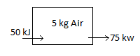 | 3 | A closed vessel contains 5 kg of air, and 50 kJ of heat is given to it. If 75 kJ of work is done by the system, then which of the following is true?(Take Cp = 1.005 kJ/kg-K, Cv = 0.718 kJ/kg-K) | The temperature of air aill decrease by 34.8o | The temperature of air will increase by 5o | The temperature of the air will increase by 7o | The temperature of the air will decrease by 7o | d |  Vessel is closed means constant volume, \(∂Q=∆U+∂W,\) \( 50=∆U+75, \) \( ∆U=mc∆T\) \(-25=5×0.718×∆T, \) \(∆T=-6.96=-7, \) The temperature of the air will decrease by 7 \(°\) | Comments | Active | |
