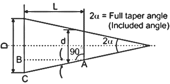 | 89 | A workpiece is taper turned using lathe, where large diameter of workpiece is D and small diameter d. If the length of this workpiece is L, then half angle α is given by: | \(tanα=\frac{(D-d)}{4L}\) | \(tanα=\frac{(D-d)}{2L}\) | \(tanα=\frac{(D-d)}{L}\) | \(tanα=\frac{(D-d)}{3L}\) | b | When the diameter of the bar either increases or decreases along the length of the bar then it is called a taper. This operation is performed on a lathe machine with the help of a taper-turning attachment. The formula for taper angle is \(α\)  tan = \( α\) \(\frac{D-d}{2L}\) where, = taper angle, D = large diameter of the bar, d = small diameter of the bar, L = length of the bar. \(α\) | Comments | Active | |