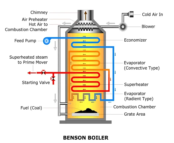 | 84 | Which of the following statements is INCORRECT about the Benson boiler? | The Benson boiler is heavier than other boilers. | The average operating pressure for the Benson boiler is higher than 200 bar. | Benson boilers can be switched on very quickly. | In Benson boilers, drums are not used. | a | Benson Boiler is a high-pressure, drumless (i.e. There is no recirculation of water​), supercritical, water tube steam boiler with forced circulation. Benson boilers can be switched on very quickly.it have lesser weight compare to other boiler.  | Comments | Active | |