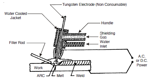 | 89 | Which shielding gas is commonly used in TIG welding? | Hydrogen | Carbon dioxide | Argon | Oxygen | c | Gas Tungsten Arc Welding, (GTAW). GTAW is also called as Tungsten Inert Gas Welding (TIG). The arc is maintained between the workpiece and a tungsten electrode protected by an inert gas. The electrode is non consumable since its melting point is about 3400°C. The arc tempe-rature may be in the range of 10,000 K. Here only one option as inert gas i.e argon  | Comments | Active | |