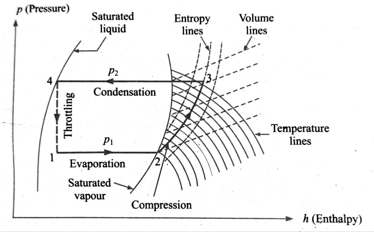 | 76 | In the P-H diagram of the vapour compression cycle, the compression process is shown by a/an _______________. | curved line | inclined straight line with a positive slope | vertical line | inclined straight line with a negative slope | b | Ideally inclined straight line with positive slope but practically it is curved line.so should go with ideal answer till not specified that it is practically.  | Comments | Active | |