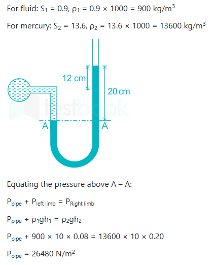 | 33 | The right limb of a simple manometer containing mercury is open to atmosphere. The left limb is connected to a pipe in which a fluid of specific gravity 0.9 is flowing. The centre of the pipe is 12 cm below the level of mercury in the right limb. The difference of mercury level in the two limbs is 20 cm. What is the pressure of fluid in the pipe (take g = 10 m/s2)? | 720 N/m2 | 26480 N/m2 | 27920 N/m2 | 27200 N/m2 | b | For fluid: S1  = 0.9, \(Ï_{1}=0.9×1000=900 kg/m^{3}\) For mercury: S2 = 13.6, \(Ï_{2}=13.6×1000=13600 kg/m^{3}\)  Equating the pressure above A – A \(P_{Pine }+ P_{left limb }= P_{Right limb}\) \(P_{Pine }+ Ï_{1}gh_{1}= Ï_{2}gh_{2}\) \(P_{Pine }+900×10×0.08=13600×10×0.20\) \(P_{Pine }=26480 N/m^{2} \) | Comments | Active | |