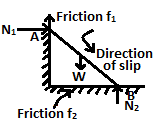 | 90 | A ladder rests on a smooth ground against a rough wall, The force of friction acts | Away from the wall at the upper end | Towards the wall at the lower end | Upward at the lower end | Downward at the upper end | b | F1 (Upper end) - along wall upward.  F2 (lower end) - Along the floor towards wall. | Comments | Active | |