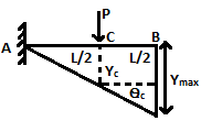 | 2 | A cantilever beam of length L carries a concentrated load P at its midpoint. What is the deflection of the free end of the beam? | PL3 / 24 El | PL3 / 48 El | PL3 / 16 El | 5 PL3 / 48 El | d |  \(Y_{max}=Y_{c}+θ_{c}×\frac{L}{2}\) \(=\frac{P(\frac{L}{2})^{3}}{3EI}+\frac{P(\frac{L}{2})^{2}}{2EI}×\frac{L}{2}\) \((Y_{max}=\frac{WL^{3}}{3EI}, θ_{mox}=\frac{WL^{2}}{2EI})\) \(=\frac{PL^{3}}{24EI}+\frac{PL^{3}}{16EI}\) \(=\frac{5PL^{3}}{48EI}\) | Comments | Active | |