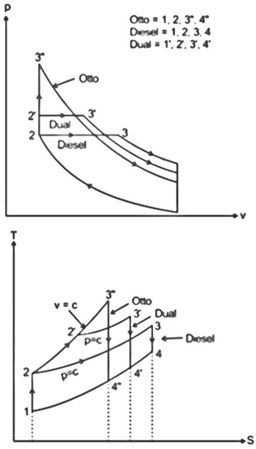 | 56 | For the same heat added and the same compression ration, ____________. | Otto cycle is more efficent than diesel cycle | Diesel cycle is more efficient than Otto cycle | Both Diesel and Otto cycle are equally efficient | Cannot be determined | a |  \(=1-\frac{Heat Rejected}{Heat Supplied}\) Since all the cycles rejected their heat at the same specific volume, process line from state 4 to 1, the quantity of heat rejected from each cycle is represented by the appropriate area under the line 4 to 1 on the T – S diagram. As is evient from the equation The cycle which has the least heat rejected will have the highest efficiency. Thus, the Otto cycle is the most efficient and the diesel cycle is the least efficient of the three cycles. \(η_{otto}>η_{dual}>η_{diesel}\) For the same compression ratio and the same heat input \(η_{otto}>η_{dual}>η_{diesel}\) For constant maximum pressure and heat supplied \(η_{diesel}>η_{dual}>η_{otto}\) | Comments | Active | |