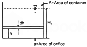 | 22 | Time of flow one tank in which water level is to another tank having level will be proportional to \(h_{1}\) \(h_{2}\) | \(h_{1}-h_{2}\) | \(h_{1}-h_{2} \) | \(h_{1}-h_{2}\) | - \(h13/2\) \(h23/2 \) | c |  Tank having cross-sectional Area “A†* Let h is the height of water at any instant in the container an “dh†is change is height in “dt†time. * Decreasing Rate of water in tank = Rate of discharge from orifice \(-Adh=cd2gh.a.dt\) \(-Ah_{1}h_{2}\frac{dh}{2gh}=cd.a0tdt\) \(-A[\frac{1}{2g}\frac{h^{-\frac{1}{2}+1}}{-\frac{1}{2}+1}=cd.a.t\) \(-\frac{A}{2g} 2(h_{2}-h_{1})=cd.a.t\) \(t=\frac{2A}{cd2g.a}(h_{1}-h_{2})\) \(tâˆ(h_{1}-h_{2})\) | Comments | Active | |