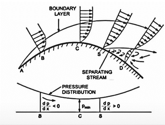 | 12 | Seperation of flow occurs when pressure gradient | tends to approach zero | becomes negative | reduces to a value when vapor formation starts | None of these | d | Flow separation occures when the boundary layer travels far enough against an adverse pressure gradient that the speed of the boundary layer relative to the object falls almost to zero. It has been observed that the flow is reversed in the vicinity of the wall under certain conditions.  A favorable pressure gradient is one in which the pressure decreases in the flow direction (i.e., dp/dx < 0) It tends to overcome the slowing of fluid particles caused by friction in the boundary layer This pressure gradient arises when the freestream velocity U is increasing with x, for example, in the coverging flow field in a nozzle On the other hand, an adverse pressure gradient is one is which pressrue increases in the flow direction (i.e., dp/dx > 0) It will cause fluid particles in the boundary – layer to slow down at a greater rate than that due to bundary – layer friction alone If the adverse pressure gradient is severe enough, the fluid particles in the boundary layer will actually be brought to rest. When this occur, the particles will be forced away form the body surface (a phenomenon called flow separation) as they make room for following particles, ultimately leading to a wake in which flow is turbulent | Comments | Active | |