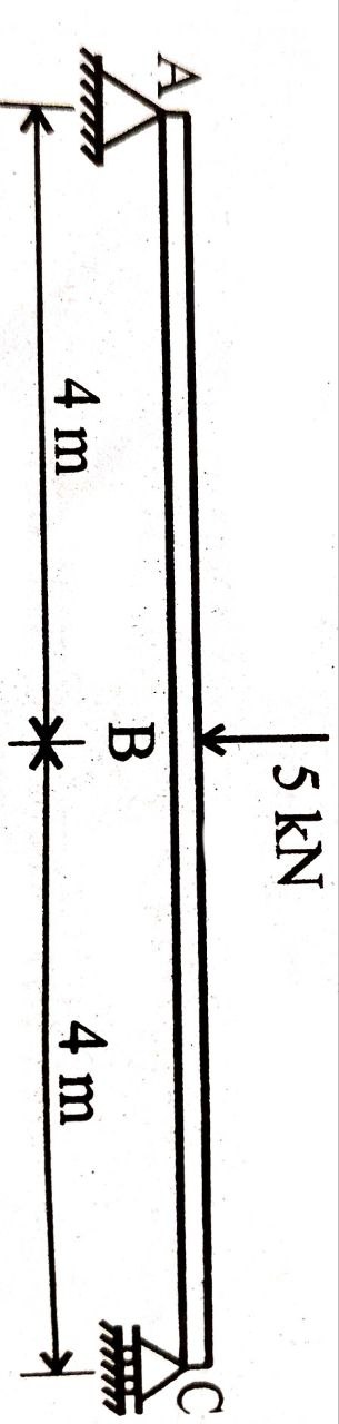 | 124 | A simply supported beam is shown below: The reaction force at ‘A’ and ‘C’ will be  | 4 kN, 4kN | 5kN, 5kN | 2.5 kN, 2.5 kN | 20 kN, 20 kN | c | From fig it is clear that \(R_{A}+R_{B}=5 kN\) Taking moment about point A \(8×R_{B}=5×4 \) \(R_{A}=2.5 kN\) \(R_{B}=2.5 kN\) | Comments | Active | |