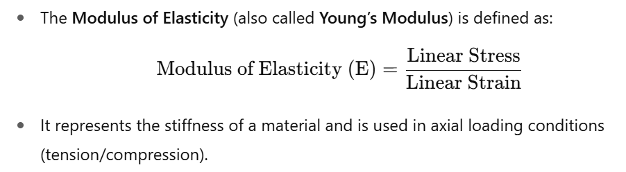| 107 | A material has a Young’s modulus of and a Poisson’s ratio of 0.25. Calculate modulus of rigidity. \(1.25×10^{5} N/mm^{2}\) | \(1×10^{5} N/mm^{2}\) | \(2×10^{5} N/mm^{2}\) | \(5×10^{4} N/mm^{2}\) | \(1.5×10^{5} N/mm^{2}\) | c | the formula \(G=\frac{E}{2(1+μ)}\) Substitute the values: \(E=1.25 ×10^{5}N/mm^{2},\) \(μ=0.25\) = \(G=\frac{1.25×10^{5}}{2(1+0.25)} \) \(\frac{1.25×10^{5}}{2.5}=5×10^{4}N/mm^{2}\) | Comments | Active | |
