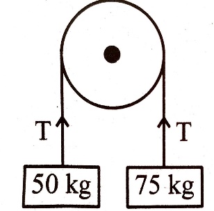 | 54 | Two loads of 50 kg and 75 kg are hung at the ends of a rope passing through over a smooth pulley as shown in fig. The tension (T) in the string is  | 50 kg | 75 kg | 25 kg | 60 kg | d | Applying Newton’s second law to both masses 75a75aTT 75a 75a T T TT T T 75 g75 g75 kg75 kg50 kg50 kg50 a50 a50 g50 g 75 g 75 g 75 kg 75 kg 50 kg 50 kg 50 a 50 a 50 g 50 g \(T=50 a+50g\) \(T+75a=75g\) After solving and putting g=10 m/s2 \(a=2 m/s^{2}\) \(T=600 N=60 kg\) | Comments | Active | |
