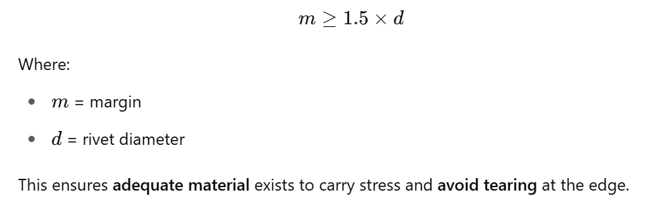 | 39 | Failure due to tearing of the plate between the rivet hole and edge may be avoided if _______. [m = margin, d = diameter of rivet] | m = d | m = 1.5d | m = 0.7d | m = 0.5d | b | Margin (m) is the distance from the center of the rivet hole to the edge of the plate. If the margin is too small, the plate may tear between the edge and the rivet hole under load. To prevent tearing failure, the standard design rule is:  | Comments | Active | |